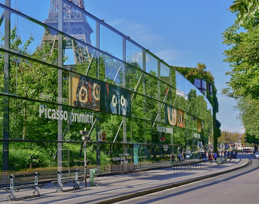 Rooftop restaurant atop the Quai Branly museum with views of the Eiffel Tower.