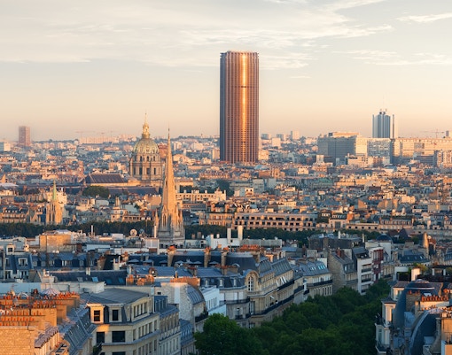 Observation deck with panoramic views, including the Eiffel Tower within the Paris skyline.